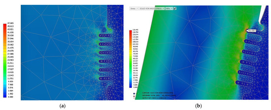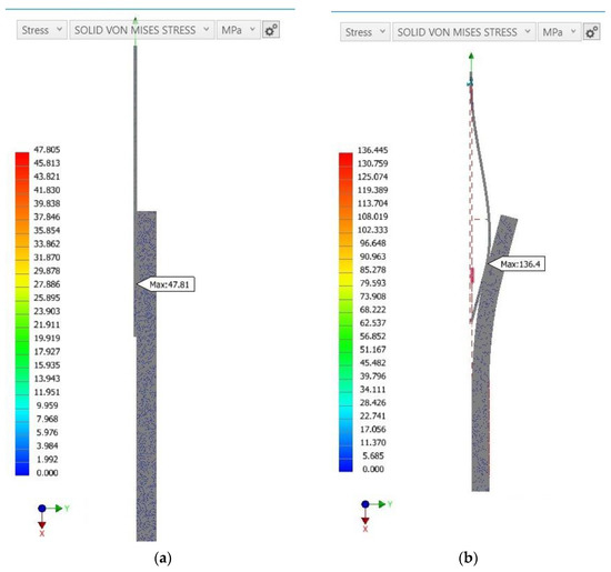 Simulation of two patterns under the same load and constraints; the example with the dot pattern (a); and the other with the line pattern (b), regarding Von Mises stress (MPa) distribution.