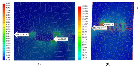 Zoomed comparison between: with fixture (a) and without fixture (b), regarding Von Mises stress (MPa) distribution.