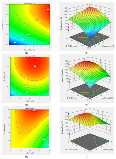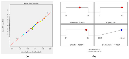 Figure 9 shows the normal plot of the residuals and the desirability ramp for the optimum parameters. As observed, the optimum condition that maximizes the shear load or breaking force is achieved at 27.3% density, 0.28 width, and 60 mm/s speed of the laser-engraving process. For the best combination of the parameters in DoE, a shear load of above 1400 N will be achieved.