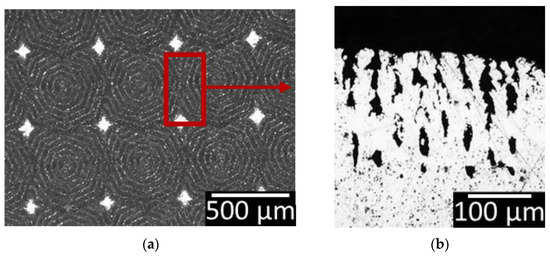 Comparing different parameters presented in Figure 11 shows the influence of each one. While Figure 11a,b shows uniform teeth with 100 mm/s speed, and 25% engraving density, Figure 11c depicts a much more chaotic appearance where the molten PP will be hindered from properly flowing into. The low speed leads to promoting melting during the ablation process. Considering the evaporation of the material during the ablation process, deep grooves are achieved. However, melting is dominant; hence, cavities are formed by interfering with the molten material. A similar observation is present at the high density of the engraved lines (see Figure 12). The intersection between consecutive dot patterns results in processing the surface of Al several times at the overlapped locations. Consequently, in addition to deep grooves, cavities are formed, which are not open to the surface and, therefore, cannot be reached by the molten PP during the joining process.
