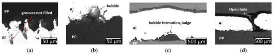 At 310 W, the grooves at the peripherals are filled completely; however, some deformations in the form of bulges start to show up on the Al surface. The observation of cross sections shows underneath the bulge as there is no adhesion occurring due to the decomposition of PP, resulting in bubble formation (see Figure 13c).