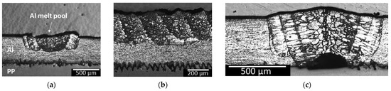 At a power modulation of 280 W, an ideal uniform, joint cross-section without PP degradation is observed as shown in Figure 14a,b. However, as mentioned earlier, the whole potential of the engravement is not used as the outer grooves are barely filled. Figure 14c shows the cross section corresponding to 310 W and above. It is worth mentioning that the samples in Figure 14 were etched with Keller’s reagent (5 mL Nitric acid, 3 mL Hydrochloric acid, 2 mL Hydrofluoric acid, 190 mL distilled water) to distinguish the size of the Al melt pool.