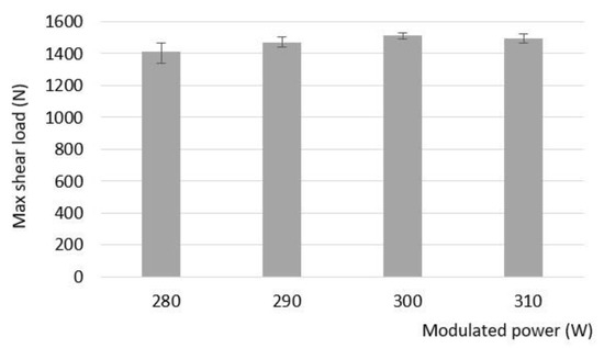 The result of tensile-shear tests measuring the maximum force in the function of the modulated power.