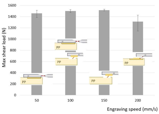Maximum shear load in the function of the engraving speed (mm/s) with the different failure modes.
