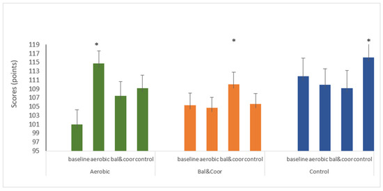 Regarding the effect of exercise on executive function, no differences were found in the current study between aerobic, balance, and coordination exercises or reading a journal. All those interventions led to a significant improvement compared to the baseline assessment. This result stands in opposition to results about the beneficial effect of aerobic exercise upon control intervention in healthy older adults [6,10,15,26]. It is possible that the intensity that was practiced in the current study during both aerobic as well as bal&coor exercises did not reach the optimal threshold for improvement in the domain of executive function [15]. In addition, it is possible that the bal&coor exercise, although based on cognitively challenging movements, was performed only once (as a single session) and thus did not reach the neural stimulation needed for induced cognitive changes [27]. Future studies should assess the effect of different bal&coor exercise intensities and durations on executive function in older adults.