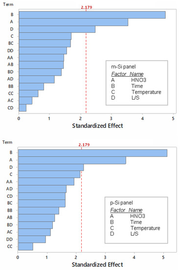 The hydrothermal leaching of Si panels revealed that the reaction time was the most important factor for Ag leaching, followed by HNO3 concentration (within the range of the tested parameters). Pareto charts of significant factor terms and their interactions in response to leaching efficiency are shown in Figure 3. These charts show the absolute values of the standardized effects from largest to smallest. A reference line (dashed) is drawn to show which effects are statistically significant. The Pareto chart is used for decision-making as it shows the effects of independent variables on leaching efficiency. The basic principle of Pareto analysis is based on the 80/20 rule, meaning that 80% of the results come from 20% of the means or causes; thus, few factors (20%) are vital, and many factors (80%) are insignificant [35,36]. Significant terms are above the dashed red line, while non-significant terms are below the red line. The L/S ratio was the least important factor for both m-Si and p-Si panels. In addition, the temperature was not a statistically significant factor for either sample (m-Si and p-Si) and there were no significant interactions between the parameters. The analysis of variance of the model is presented in Table S1 (Supplementary Materials).
