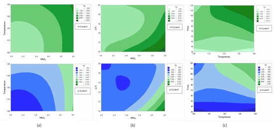 Figure 4 presents the interaction between time and HNO3 concentration regarding Ag leaching. Ag leaching efficiency increased significantly with increasing leaching time using 2 N HNO3 for p-Si and m-Si. Figure 5 shows other factor interactions. Increasing the HNO3 concentration and temperature also increased leaching efficiency; however, their effect was less significant than increasing the hydrothermal processing time. Reducing the L/S ratio increased the leaching yield, i.e., the concentration of Ag was higher. The main effects plots of temperature, time, L/S ratio and HNO3 concentration on Ag leaching are depicted in Figure S1 (Supplementary Materials). The combination of temperatures, times, HNO3 concentrations and L/S ratio in Ag leaching experiments resulted in leaching yields ranging from 0.12% to 74% for p-Si, while for m-Si, the efficiency of Ag leaching ranged between 5.7% and 66.2%. The highest Ag leaching yield was achieved at 2 N HNO3, L/S = 10, 120 °C and 75 min. The lowest yield value was achieved at 1.5 N HNO3, L/S = 15, 100 °C and 30 min. Based on the optimization obtained using mathematical equations defining the BBD/RSM, the optimized conditions to maximize Ag leaching (i.e., a 100% yield) through hydrothermal treatment are 2 N HNO3, L/S = 10, 140 °C and 2 h leaching, which was experimentally validated.