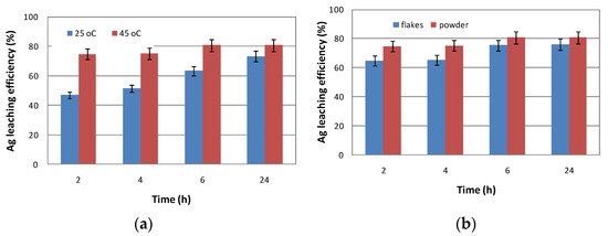 The effect of stirring on Ag leaching was significant, with leaching efficiency increasing by 40% when stirring at 200 rpm (2 N HNO3, L/S = 10, 45 °C, 2 h); thus, stirring was applied to all subsequent experiments at 25 °C and 45 °C (Figure S3 Supplementary Materials). The positive effect of stirring was ascribed to the access of metals to the leaching agent [33]. The effect of temperature is illustrated in Figure 6a for m-Si. It was observed that leaching with 2 N HNO3 for 6 h at 45 °C had 80% efficiency, compared with 63.3% efficient at 25 °C; thus, the temperature of 45 °C was used in subsequent experiments. Next, leaching was performed at 45 °C for powder and flaked m-Si and p-Si panels. For m-Si panels, the maximum Ag leaching efficiency from flakes was 76.5% at 6 h; meanwhile, for p-Si panels, the leaching efficiency was 78% at 6 h (Figure 6b). Thus, the use of the powdered sample increased the leaching efficiency by 4.7–5.4%. Complete Ag leaching could not be achieved under low temperature conditions, even when the reaction time was increased to 24 h (2 N HNO3, L/S = 10). For 24 h leaching, the Ag efficiency was 80.7% and 85.3% from m-Si and p-Si waste panels, respectively. However, Theocharis et al. [20] observed almost total leaching (100%) from PV flakes for 5 h leaching at 25 °C but with a 3 N HNO3 concentration, while for PV powder, 100% leaching efficiency was achieved at 25 °C, 3 N HNO3, for 2 h. Furthermore, Chen et al. [37] reported 99.4% Ag leaching efficiency at 80 °C with 5 N HNO3 for 1 h.