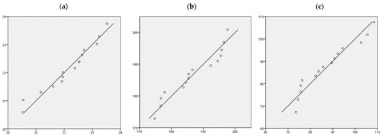 Normally distributed Q–Q plots: (a) age; (b) height; and (c) weight. The vertical axes are the expected normal distribution values; the horizontal axes are the observed values.