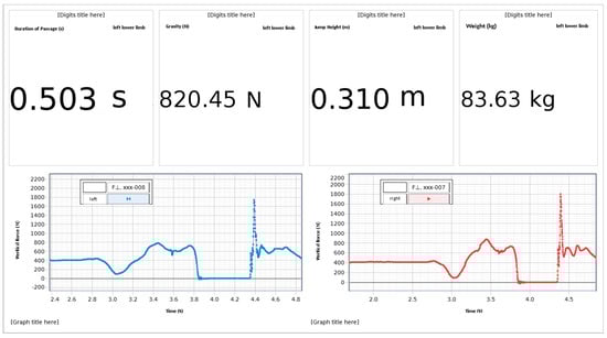 This study used a PASCO scientific biaxial force plate, which connected laboratory equipment to remote equipment (via Bluetooth and tablet connection). Participants stood on the force plate to perform the countermovement jump (CMJ), then stood still on the force plate for a few seconds after they landed. The pre- and post-test results obtained by the force plate included the RFD, the time of the RFD, the GRF at the moment of jumping, the time in the air, and the jump height. After an 8-week PT program, it was found that there were significant differences (p < 0.05) between the pre- and post-tests, as shown in Table 4. The force plate test showed the data of each participant; however, only the data for participant No. 1 are reported in this article, as shown in Figure 2 and Figure 3.