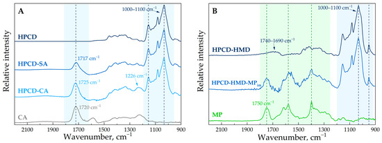 For HPCD-SA, we observed a similar pattern as for HPCD-CA (Figure 2A). The appearance of an intense band at 1717 cm−1 corresponding to the C=O group in the polymer network. Thus, the formation of two ester polymers was confirmed.