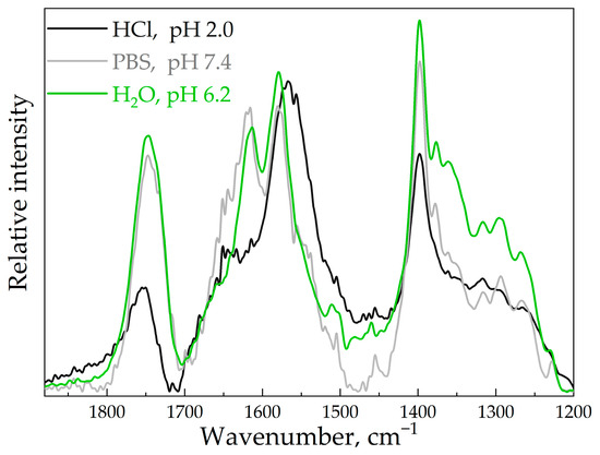 The effect of 1750 cm−1 band intensity decreasing might indicate the participation of MP’s carboxylic group in hydrogen bonding via complex formation with HPCD polymer matrix, as it was demonstrated previously for MP-CD complex in [2]. If this band corresponds to the carboxylic group, this spectral region has to be pH-sensitive. In the independent experiment, we compared spectral patterns for MP solutions with various pH values (Figure 3).