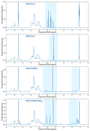 1H NMR spectroscopy confirms the polymers formation (Figure 4 and Figure S3). Briefly, the multiplet at δ 3.40–4.11 ppm refers to H2–H5 of the D-glucopyranose units, signals at δ 5.01–5.31 ppm to H1 of the D-glucopyranose units and doublet at δ = 1.13 ppm, J = 6.2 Hz to the protons of the hydroxypropyl substituent, respectively [14]. In 1H NMR spectra of all HPCD polymers, we observed the signals that correlate to both the monomer and the linker. In the case of HPCD-HMD-MPim, the peaks that were assigned to MP are also present in the spectrum [30].