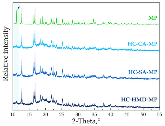Experimental PXRD patterns for MP, HPCD-CA-MP, HPCD-SA-MP, and HPCD-HMD-MP. No more signals were detected from 55° to 80°.