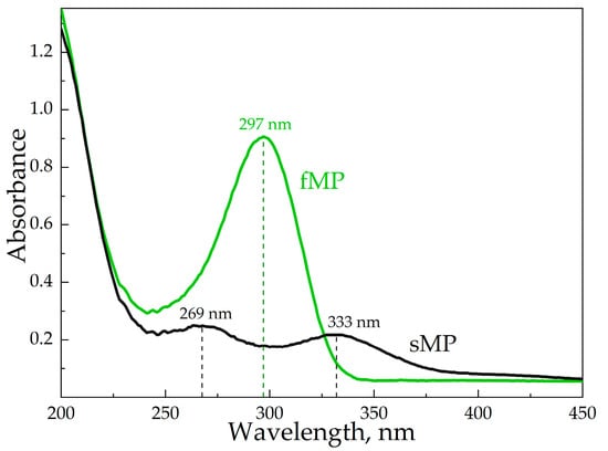 MP’s state can be successfully monitored using UV-spectroscopy. Freshly prepared MP solution (fMP) demonstrates the peak at 297 nm (Figure 6), whereas after 2 months of storage (sMP), we observed two low-intensity peaks at 269 and 333 nm. Consequently, MP’s degradation rate can be tracked by the intensity and the position of the initial peak.