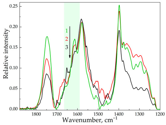 The normalized FTIR spectra of “fresh” MP solution (1) and MP solution stored for 1 day (2) and 6 days (3), CMP = 0.01 M, 22 °C.