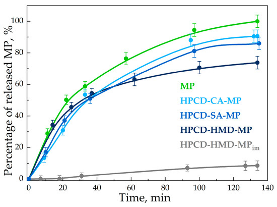 The release kinetics of MP, HPCD-CA-MP, HPCD-SA-MP, HPCD-HMD-MP, and HPCD-HMD-MPim, CMP = 0.3 mM, 37 °C.