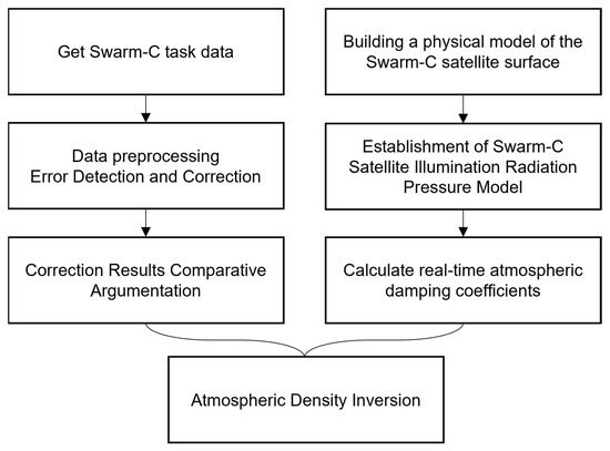 The main points of this paper are as follows: the Swarm-C accelerometer data were corrected by referring to the correction method of the GRACE-A satellite accelerometer [25,26]. The correction results were compared with the data correction results published by ESA (https://earth.esa.int/eogateway/missions/swarm/data) (accessed on 18 November 2022). Then, the satellite surface shape model was established, and the simplified conical shadow model replaced the traditional cylindrical shadow model for light radiation pressure modeling [27,28]. The similarities and differences between the modeling effects of the two models were compared. Finally, the atmospheric drag coefficient of the Swarm-C satellite was calculated [29,30], and the atmospheric density was retrieved.