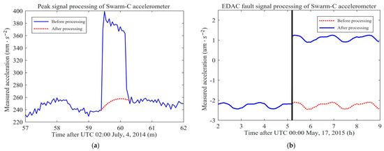 In the accelerometer data of the Swarm-C satellite, the accelerometer data abnormality caused by the EDAC fault event also needs preprocessing. For example, Figure 2b records an EDAC failure event of the Swarm-C satellite on 17 May 2015. The curve of accelerometer data shows a massive step after experiencing the EDAC failure event. The blue signal represents the data before correction, and the red curve represents the accelerometer data after correction.