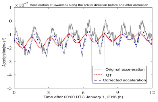 This article calibrates and discusses only the acceleration data along the satellite orbit direction. The acceleration data in other directions can be performed in the same way.