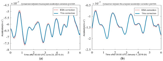 The comparison between the results from the improved correction method and the ESA correction is shown in Figure 4. Among them, Figure 4a is the result of the correction by the magnetic storm day accelerometer data. Figure 4b is the correction result of a nonmagnetic storm day.