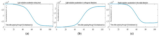 Light radiation acceleration (LRA) when Swarm-C after full-shadowed. (a) LRA along the orbit; (b) LRA in orthogonal directions; (c) LRA in the radial direction.
