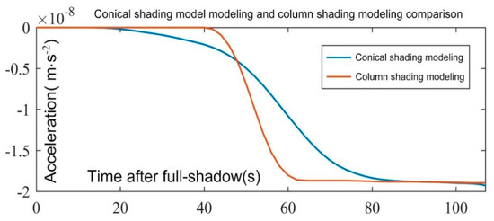 In order to evaluate the effect of the simplified conical shadow model and ensure the accuracy of the satellite surface light radiation pressure modeling, the satellite light radiation pressure acceleration along the orbital direction through the penumbra in the conical shadow model is modeled using the column shadow model. Then, the modeling results are compared using the simplified conical shadow model. The results obtained by modeling the satellite along the orbital direction using the cone-shadow model and the column-shadow model are shown in Figure 8.