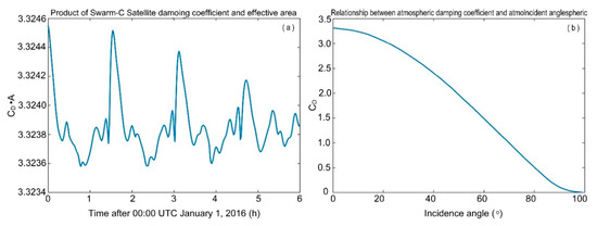 Combining the atmospheric drag coefficient calculation method and the normal vector parameters of each satellite panel obtained by the abstraction of the surface shape of the Swarm-C satellite, the product of the drag coefficient and the effective area of the Swarm-C satellite was obtained. Figure 9a shows the variation of the drag coefficient’s product and the Swarm-C satellite’s effective area obtained using Equation (4).