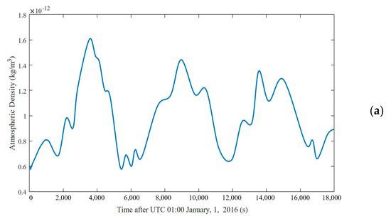 The product of the effective area of the drag coefficient of all satellite panels is added to obtain the result of the overall drag coefficient and the product of the effective area of the satellite. The final atmospheric density around the satellite orbit can be calculated using Equation (5), where represents the drag acceleration.
