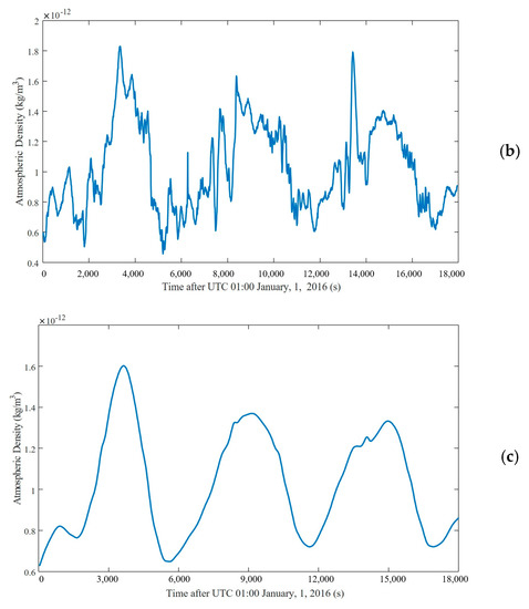 NASA researchers calculated 31 years of satellite data to obtain the average value of the bounce tract coefficient, which is a very accurate value. However, this method requires a very accurate atmospheric model. The current atmospheric model cannot guarantee accuracy in extreme environments, so obtaining the accurate value of the bounce tract coefficient in extreme environments is impossible. Therefore, in this paper, the Sentman model was used to calculate the real-time atmospheric drag coefficient instead of the average drag coefficient value, giving the later calculated atmospheric density a better real-time and dynamic performance. Since the accelerometer density on Swarm-C has been published by Siemes et al. [24] and can be retrieved, we selected the data on 1 January 2016, as a comparison. Since the accelerometer retrieval density obtained from http://thermosphere.tudelft.nl/ started at 01:00 on the 1st of January 2016, we used the data from the same period for comparison. At the same time, we also obtained the provided POD (Precise Orbit Determination) inversion density data, which were also presented in the figure. Figure 10a–c shows the thermospheric atmospheric density time series calculated by the accelerometer inversion method in this paper and the density time series published by Siemes et al.