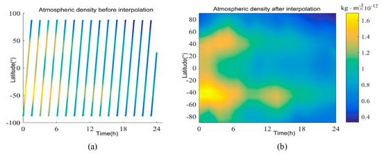 Time–latitude distribution of atmospheric density on 1 January 2016. (a) Before interpolation; (b) after interpolation.