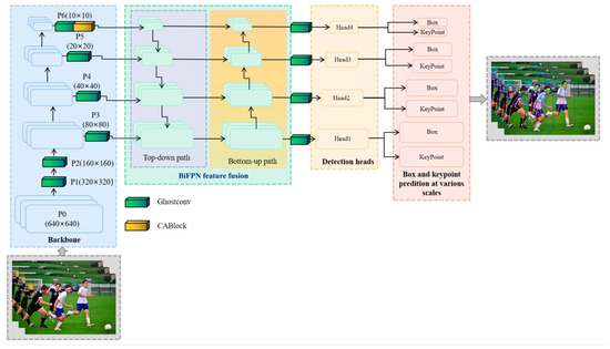 The proposed network is improved with Yolo-Pose network as the framework, and Figure 1 displays the architecture. Based on Yolov5, a classic efficient network in object detection, four components make up the entire network: backbone network, feature extraction and fusion module, detection module, and multi-scale prediction output module. The backbone network was constructed by CSP-darknet. We integrated GhostNet into this section to increase the network’s effectiveness. The BiFPN module was introduced in the feature fusing module to achieve two-way fusion of extracted multi-scale characteristics from the backbone. Then, four various scales of detection heads were connected. At the end of the network, each detection head connected two decoupled prediction heads to output the human regression box and human skeleton key point information.