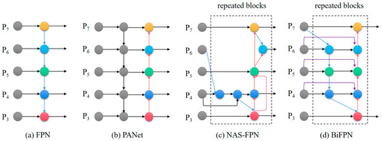 Many cross-scale connection methods have been put forward in previous studies, the most classic of which is the pyramid network FPN (feature pyramid network). There have been several FPN-based improvement methods, such as PANet [37] and NAS-FPN [38]. Regrettably, the above strategies either have significant computational cost or fail to fuse the features effectively. BiFPN (bidirectional feature pyramid network) [39] first removes nodes with a degree of 1 from PANet. Then, a jump connection is built at the identical scale between the input and output nodes. Finally, each two-way (top-down and bottom-up) path is considered a feature network layer (repeated blocks) and the same layer is repeated multiple times to achieve a higher level of feature fusion [40]. The network structure of the BiFPN module is compared with other feature fusion modules, as depicted in Figure 5.