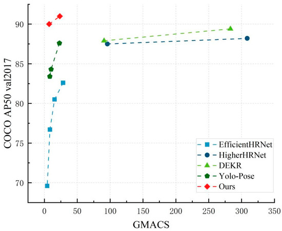 To more accurately assess each enhanced module’s contribution to the overall network model, Figure 9 shows the comparison of AP50 of the five methods in the above ablation experiment based on different network computations and on the COCO 2017 validation set. First of all, it is clear from the comparative data in the figure that each enhanced module reduced the computational complexity of the original network to varying degrees, which significantly boosted the accuracy of the network. According to the data of the first 50 iterations, among the GhostNet, coordinate attention mechanism, and BiFPN modules, the GhostNet module contributed the most to the improvement of network lightweight and accuracy. This demonstrated that by breaking down the convolution process and linear transformation operations, GhostNet may considerably improve network accuracy while lowering the computing cost of convolution networks and producing more useful feature maps. Although the BiFPN module did not significantly reduce the amount of model calculations, it made a greater contribution in terms of enhancing the model’s accuracy, which showed that the module could effectively use the features extracted from the previous network through bi-directional fusion and perform weighted evaluation of features of different scales in the network, thus enhancing the model’s precision for human keypoint detection.
