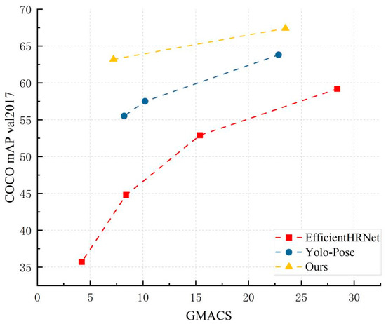 As a member of the lightweight human posture estimation networks, the model detection accuracy and experimental effect of our proposed network were compared with other lightweight networks in the same task. Table 3 and Figure 7 show the average accuracy comparison between the improved network in this paper and other network models with less than 30 GMACS in the COCO2017 validation dataset. Data from our model experiment are explicitly displayed in bold font in Table 3. It can be concluded from the results that, with lower input size, the performance of our model was far higher than that of state-of-the-art models such as EfficientHRNet. Our presented method had less computational cost than the original Yolo-Pose network but also had much higher average accuracy.