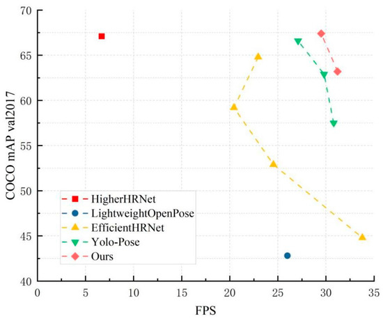To further investigate the performance and operational efficiency of our method, we compared the inference speed and corresponding average accuracy of the proposed model with other classical human keypoint detection methods on the COCO 2017 validation dataset, especially for some lightweight models. FPS (frames per second) served to quantify the inference speed. The experimental comparison results are shown in Table 4 and Figure 8. The bold text in Table 4 shows the results of our model experiment. According to the data, our approach not only had higher detection accuracy than the original network, but it also sped up inference. HigherHRNet employs HRnet as its backbone. Its network structure features numerous branches and parallelism, which have a detrimental impact on the network’s actual inference performance. Not only that, but our approach retained a comparable inference speed and significantly outperformed lightweight human posture estimation networks such as EfficientHRNet in terms of detection accuracy. The experimental results demonstrated that our method greatly improved the performance of the model by fusing the lightweight module GhostNet, improving the feature fusion module, and introducing the coordinate attention mechanism, which can thus meet the requirements of real-time deployment.