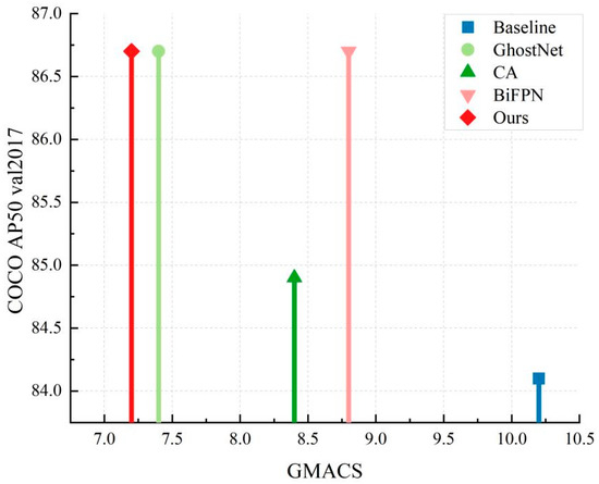 The results of the ablation experiments showed that the GhostNet, coordinate attention mechanism (CA), and bi-directional feature pyramid network (BiFPN) modules contributed significantly to the enhancement of our model’s performance.