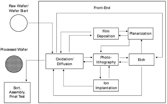 However, besides supply networks, manufacturing is also complex in the semiconductor industry [5,8,9]. The four principal stages of the semiconductor manufacturing process are wafer fabrication and probe, generally referred to as front-end operations, and assembly and test, referred to as back-end operations [4,5]. The front end is usually located in highly industrialized countries, while the back end is often located in countries with low labor costs due to the higher manual effort involved [4]. In wafer fabrication, the most complex part of the overall process, layers of material with different electrical characteristics are built up on a raw wafer. To build these layers, the following process steps have to be performed repeatedly on the wafer: oxidation/diffusion, film deposition, photolithography, etch, ion implantation, and planarization (cf. Figure 1). For a more in-depth technological description of the process steps, please refer to the literature [4,10]. The result of this process, which takes place in a dedicated facility referred to as a wafer fab, is a wafer containing between several hundred and several thousand individual devices [5].