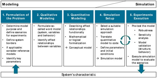A model on the other hand is a simplified reproduction of a planned or existing system [15]. It is characterized by the three criteria mapping, reduction and pragmatism [17]. Mapping describes that a model always represents a natural or an artificial original. However, a model does not capture all attributes of the original, but only those that seem relevant to the model creator or the model user—a reduction. Furthermore, as described by pragmatism, models are not uniquely assigned to their originals. They fulfill their replacement function for certain subjects, within certain time intervals and under restriction to certain mental or actual operations. We can distinguish between conceptual models and simulation models, also referred to as computer models [15,16]. The conceptual model is a non-software-specific description of the model that is to be developed. It contains the objectives, inputs, outputs, content, assumptions and simplifications of the model [16]. In implementation, the conceptual model is, for the purpose of simulation, converted into an executable simulation model. Execution is not strictly limited to computers. However, nowadays most models are executed on a computer using spreadsheets, programming languages or specialist simulation software [15,16].