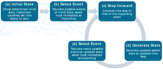 Simulation approaches can be differentiated by their modelling of the progress of time in time-slicing simulation, discrete-event simulation and continuous simulation [16,19]. Discrete-event Simulation (DES), as often used to simulate manufacturing systems, only represents the points in time when the state of the system changes. Therefore, the system is modelled as a series of events as instants in time when a state change occurs. The state of the system is only determined when an event takes place. The time of the simulation run, thus, jumps from one event to the next, whereas the interim state of the system is either assumed to be unchanged or nondeterministic [16,19,25]. Examples of events are incoming customer orders or machines starting to produce [16]. Figure 3 describes the method of DES. Steps (c) to (e) are repeated until the events for the entire timeframe of interest have been generated. However, as the simulation loop can go on forever, it is necessary to establish some terminating conditions [19]. In the understanding of DES above, a state is a description of a situation that is given at a certain point in time [15].
