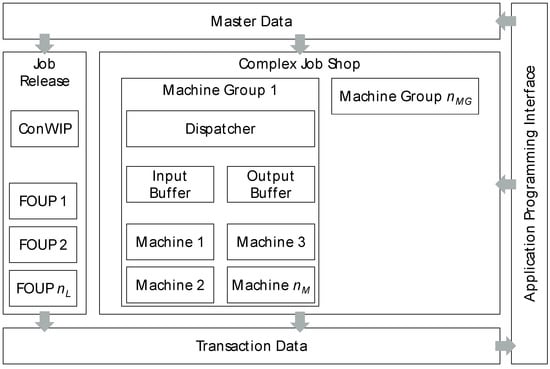 Since not all machine groups were used in MIMAC’s work routes, it was possible to compress CoJoSim to 69 machine groups (nMG). Each machine group consists of an individual number of machines, up to 12 in total (nM). CoJoSim is then parametrized by the described master data of work routes, machine groups and wafer starts resulting from job releases. Therefore, the model could easily be adapted by changing the respective master data. It is therefore very flexibly adaptable to various applications. According to Figure 4, CoJoSim’s conceptual reference model is structured in a module “Job Release” (JRM) and a module “Complex Job Shop” (CJSM) each containing various submodules. When running the implemented simulation model (cf. Section 4 and Section 5), transaction data is generated. All data and modules of CoJoSim could be accessed by an application programming interface (API). This API allows external software to read and write data to the simulation model.