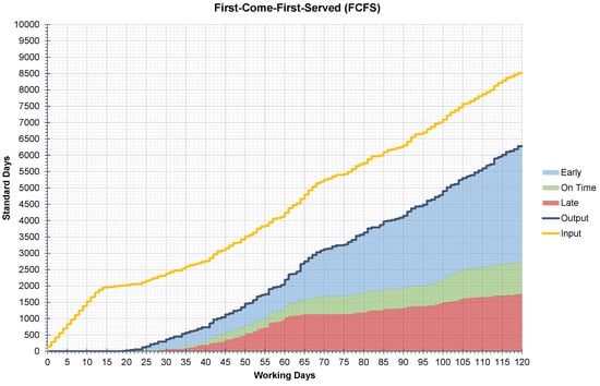 The reference implementation of CoJoSim was applied to evaluate and compare different dispatching rules. For this purpose, 120 days were simulated and the manufacturing feedback data were continuously recorded to calculate key performance indicators (KPIs). These KPIs were then visualized and analyzed using throughput diagrams [56]. Since these diagrams focus on quantities without considering adherence to delivery dates, the output during the reference period in the throughput diagrams was split and colored for jobs that were early, late, and on time. To calculate adherence to delivery dates, early jobs and on-time jobs were summed. For more information on calculating KPIs and logistic targets, as well as analyzing throughput diagrams, the literature [7,56] can be referred to.In the application, five dispatching rules were evaluated and combined. The first rule used was first-come-first-served (FCFS), which was used as a reference and is also the basic way of prioritization in the underlying MIMAC. The second rule is priority classes (PC), a rather simple dispatching rule. The third rule is delta flow factor (DFF), which considers the tardiness of the jobs. The fourth rule is shortest remaining processing time (SRPT), which prioritizes jobs with a higher degree of completion. The fifth rule is a slack-based dispatching rule (Slack), which combines DFF and SRPT. Figure 6 shows the throughput diagram for FCFS, which serves as a reference for comparing the other four dispatching rules. Table 4 presents the results of the four simulated dispatching rules for prioritizing jobs in CoJoSim. FCFS has a mean throughput of 6275 standard days (for a 120 working days simulation duration) and a mean adherence to delivery dates of 71.36% and is used as a reference. The following dispatching rules have the common objective of influencing and improving adherence to delivery dates compared to this reference. With DFF and SRPT, mean throughput and mean adherence to delivery dates can be slightly increased compared to the reference. A significant improvement is possible with PC, and the best results are achieved with Slack. An improvement in adherence to delivery dates of almost 15 percentage points was achieved by Slack compared to the reference. The throughput diagram for Slack is shown in Figure 7.