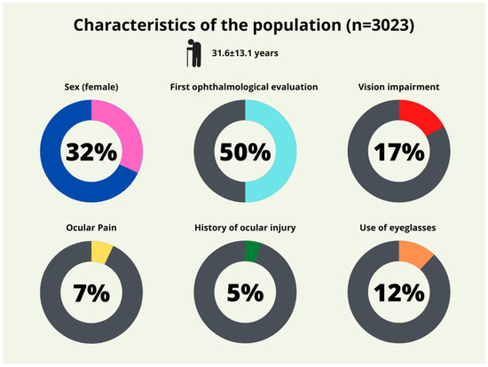 The questionnaire replies showed that 50.4% of subjects had never had an eye examination, with an additional number who were unable to provide a definitive response (8.9%). Most participants (86.2%) were unaware of their family’s medical history. In addition, most of the patients claimed vision impairment (16.6%), ocular pain (6.6%), and previous history of ocular injury (5.2%). Finally, the use of eyeglasses was reported by 12.0% of the sample. A summary chart is reported in Figure 2.