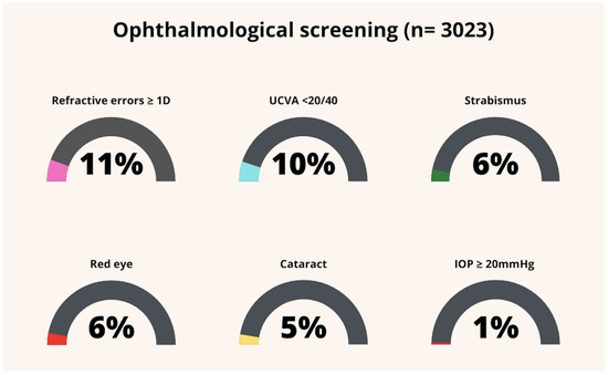 The most frequent eye alteration in our population was a refractive error; in fact, this was found in 11% of all participants, and it was distributed between myopia (9.8%) and hyperopia (1.2%) among all subjects.