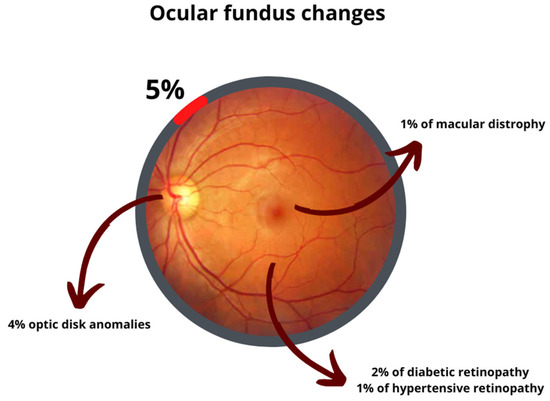 The frequency of ocular fundus changes was 5%, with several possible causes shown in Figure 4. In particular, ten subjects had isolated cotton wool spots and four participants showed some microaneurysms without a documented history of diabetes that required further examination in a specialist hospital. Indeed, 60% of patients with optic nerve abnormalities had bilateral symmetric changes in terms of cup disc ratio.
