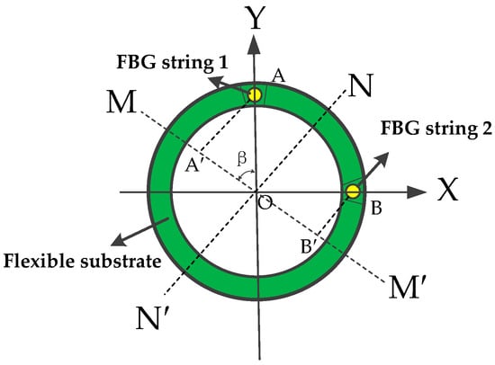 Figure 1 is a cross-section diagram of the FBG strings layout of the sensing flexible substrate. MM′ is the neutral plane of the flexible substrate, and NN′ is the curved plane. MM′s plane and NN’s plane are perpendicular to each other. AA′ is the distance FBG string 1 to the neutral plane MM′. . BB′ is the distance FBG string 2 to the neutral plane MM′. . β is the included angle between MM′ and Y-axis. According to Equation (3), the strain variables of FBG strings in the X direction and Y direction are, respectively: