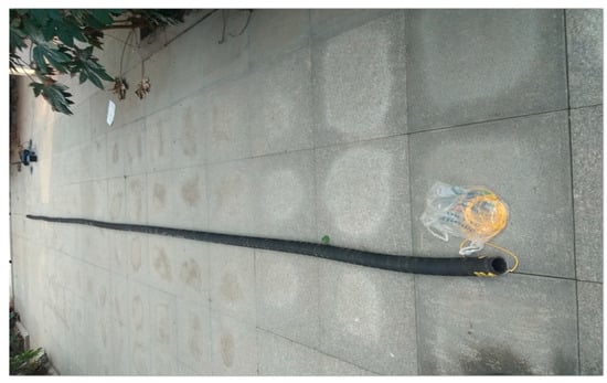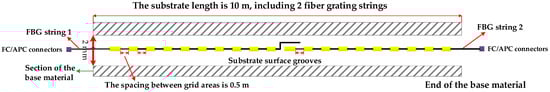 Based on the curvature sensing principle of FBG in Section 2.1, this study designed and developed a 3D curvature sensor of FBG suitable for the complex underground environment of a coal mine, which can be used to perceive curvature information of discrete points in the orthogonal direction. The sensor comprised a mining rubber tube with grooves in the orthogonal direction of the surface of the flexible substrate and pasted with a fiber grating string, including a flexible substrate and two fiber Bragg grating strings. In order to ensure that the 3D curvature sensor of FBG can be coordinated with the bending deformation of the scraper conveyor, the selection of the flexible substrate adopts a mining rubber tube with a large deformation ability and strong recovery ability. The cross-section of grooves on the surface of the flexible substrate in the orthogonal direction is shown in Figure 2. In order to improve the sensing accuracy of the 3D curvature sensor of FBG as much as possible, the grating interval of the FBG string is set to 0.5 m. Considering the wavelength demodulation range of the FBG demodulation instrument, 10 grating points are evenly arranged on each FBG string, and one end of the FBG string is equipped with an FC/APC connector. The FBG is laid in the grooves of two orthogonal directions of the rubber pipe for mining using a butt joint. The specific butt joint method is shown in Figure 3. The design and encapsulation of the sensor are shown in Figure 4.