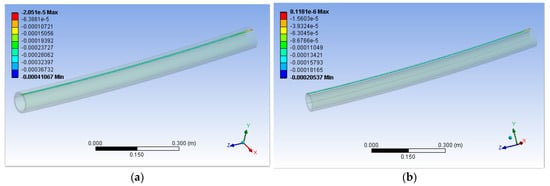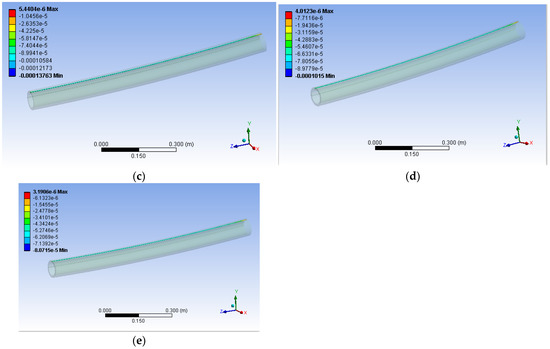 In order to verify the correctness of curvature—strain relationship, finite element simulation is carried out by Ansys workbench. By adding a fixed constraint at one end of the flexible substrate and deflecting the other end by a certain angle along the direction of the X-axis, the curvature radius of the curvature part of the three-dimensional FBG curvature sensor model is made to be 100 m, 200 m, 300 m, 400 m and 500 m. The relationship between the strain characteristics of the FBG string at the bending side of the pressure sensor and the curvature at the bending side is analyzed. After building the model and dividing the grid, 1,425,803 units and 306,242 nodes were generated. The outer diameter of the sensor is 80 mm, the inner diameter is 60 mm, the thickness is 10 mm, the elastic modulus is E = 6.11 MPa, and the Poisson ratio μ = 0.49. The model of FBG string is NZS-FBG-S, and the main material of bare fiber is glass silica. The elastic modulus of bare fiber is E = 72 GPa, and the Poisson ratio μ = 0.17. Figure 5a–e respectively show the strain characteristics of sensor fiber grating strings under different curvature states.