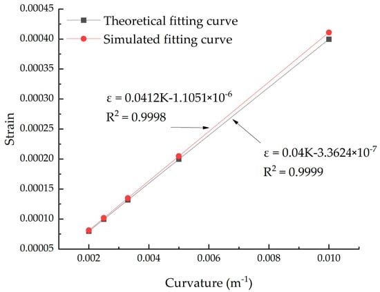 where is the distance from the fixed surface of the FBG to the neutral surface; is the radius of curvature of the measuring point; is the curvature corresponding to this point. Given and in Equation (3), the strain of the FBG can be obtained. According to Equation (2), the strain is directly proportional to the change of the central wavelength of the FBG, so the curvature is directly proportional to . Therefore, according to Equations (2) and (3), the relationship between and can be obtained: