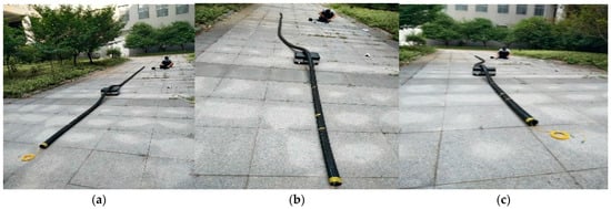 According to the mining technology and terrain characteristics of the comprehensive working face, the bending state that may exist in the actual production process of the scraper conveyor is analyzed, the bending test of the scraper conveyor under the three-dimensional straight line, three-dimensional bending state 1 and three-dimensional bending state 2 will be carried out, respectively, in this test. The specific layout of the test is shown in Figure 8.